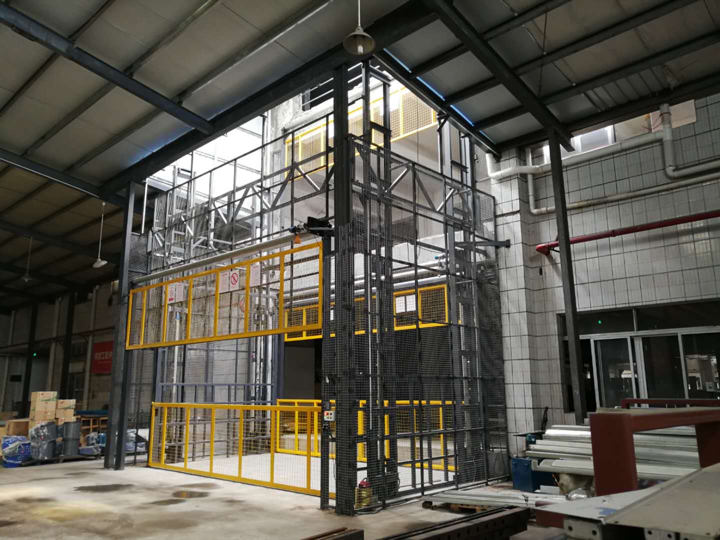 四柱式升降平臺(tái)采用了四角立柱+液壓油缸+板式鏈條+鋼絲繩等4重安全防護(hù),且各樓層間設(shè)有限位開(kāi)關(guān)及緩沖設(shè)備,緩解了升降平臺(tái)到達(dá)制定樓層時(shí)的緩沖力,且平臺(tái)設(shè)有緊急停止按鈕、緊急下降按鈕等,為各類突發(fā)事項(xiàng)做好了萬(wàn)全準(zhǔn)備。
